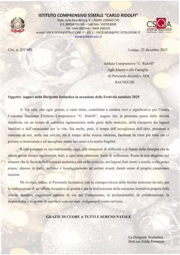 dal 22 Dic 2025 al 06 Gen 2026 Auguri della Dirigente Scolastica in occasione delle Festività natalizie 2025