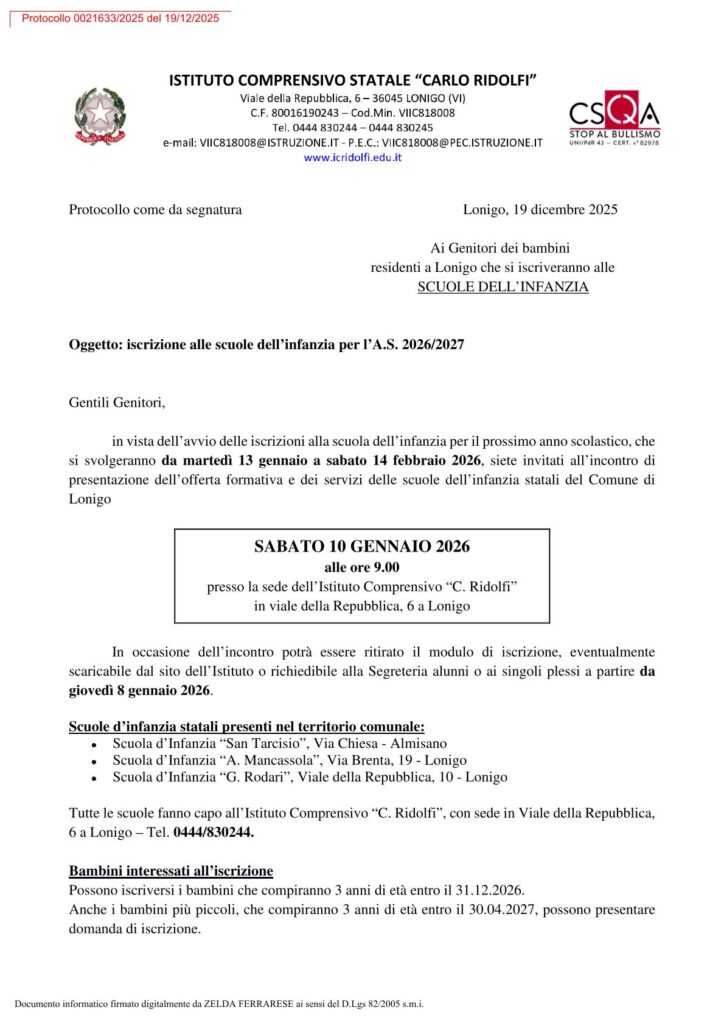 Lettera per l’iscrizione alle scuole dell’infanzia per l’A.S. 2026-2027 prot. n. 21633/2025